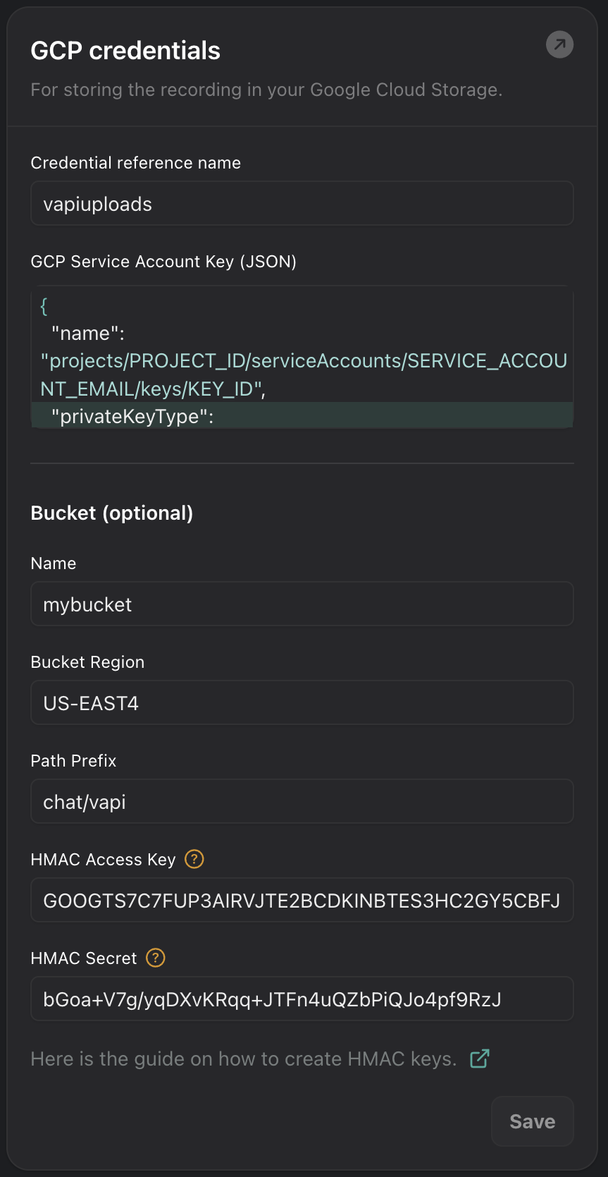 Your assistants can be configured to record chat conversations and upload the recordings to a bucket in GCP Cloud Storage when the conversation ends. You will need to configure the credential and bucket settings in the “Cloud Providers” section of the “Provider Credentials” page in the Vapi dashboard.