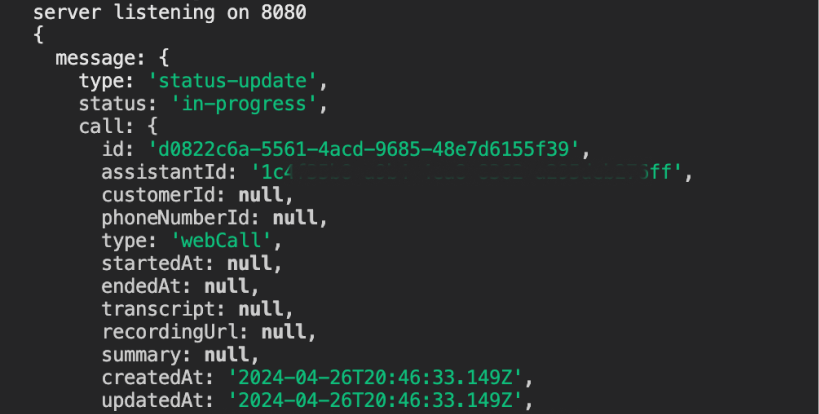 We will now be able to see call events come through as POST requests, & can log payloads to our terminal.
