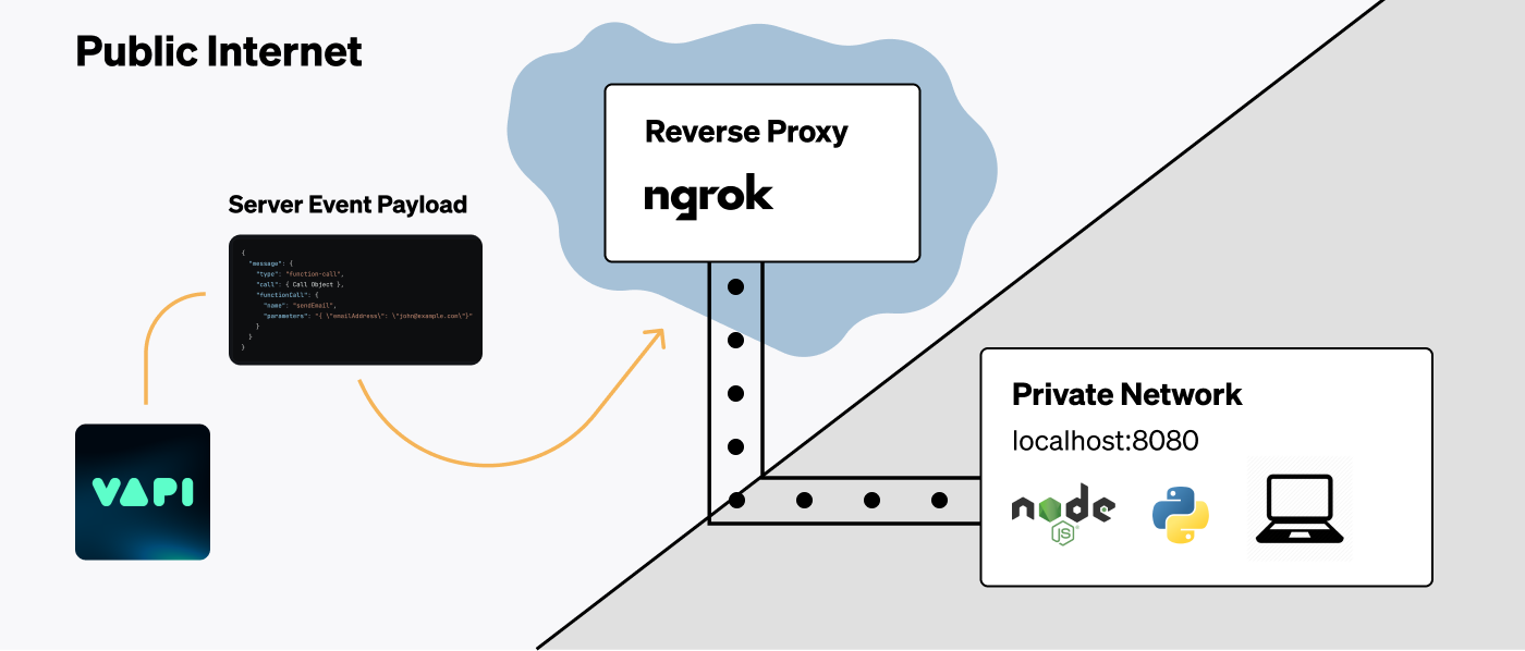 When Vapi dispatches events to a server, it must be able to reach the server via the open Internet.